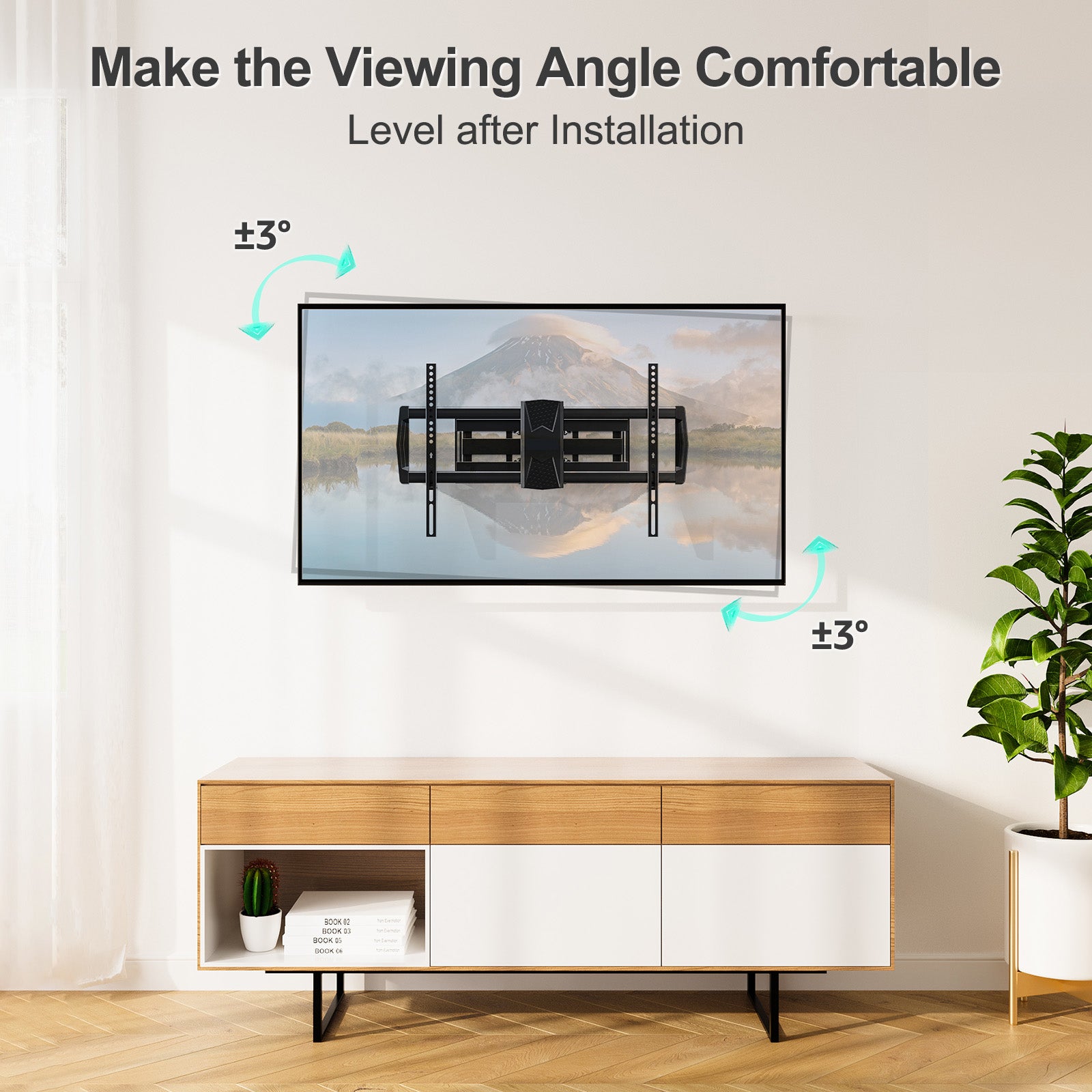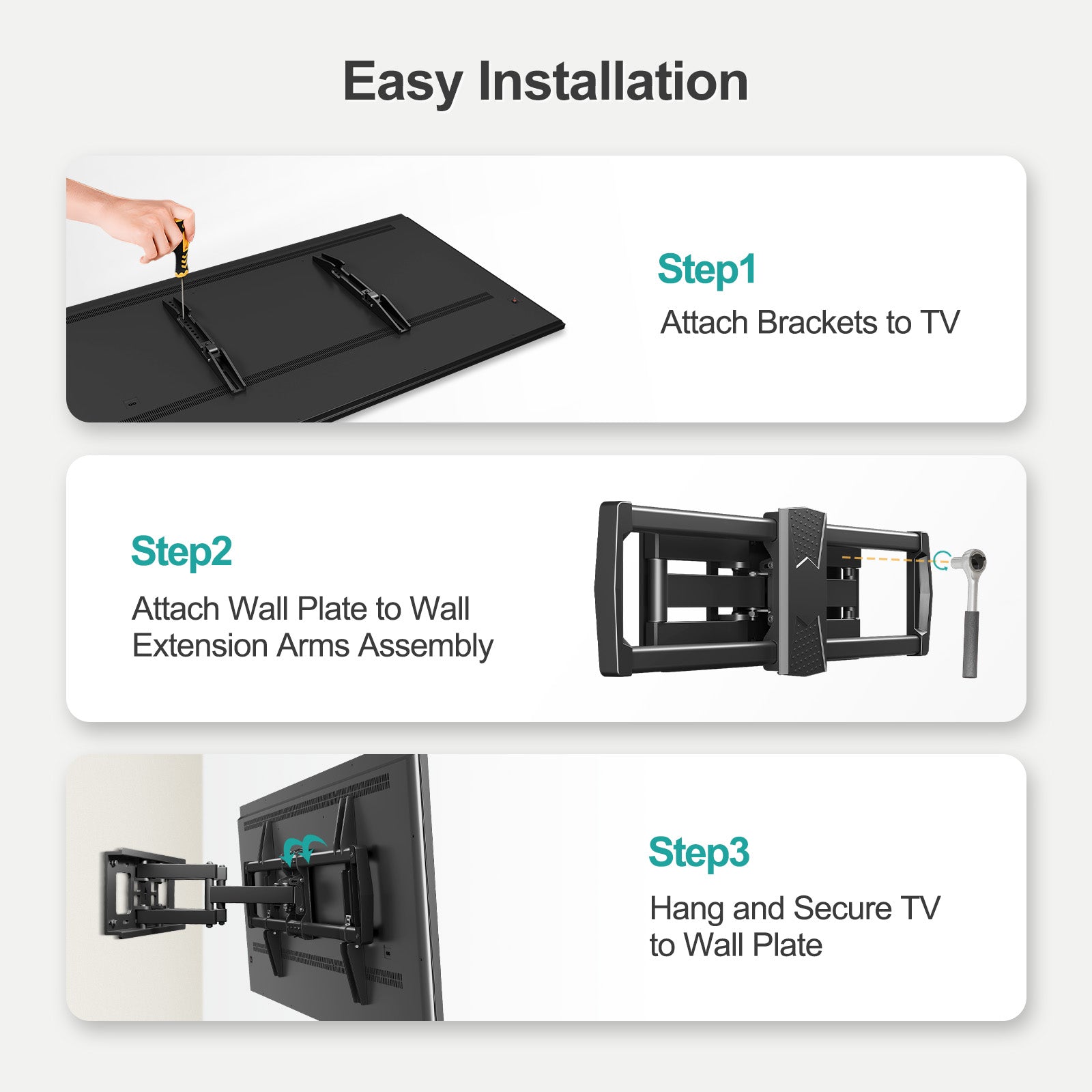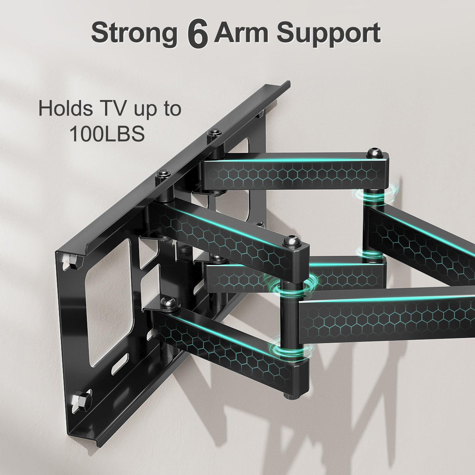 - 【6 Support Design】The articulating television mount features a 6-support design, made of sturdy cold-formed steel. Each wall bracket is rigorously tested for load bearing before leaving the factory to ensure the safety of the TV and your family.