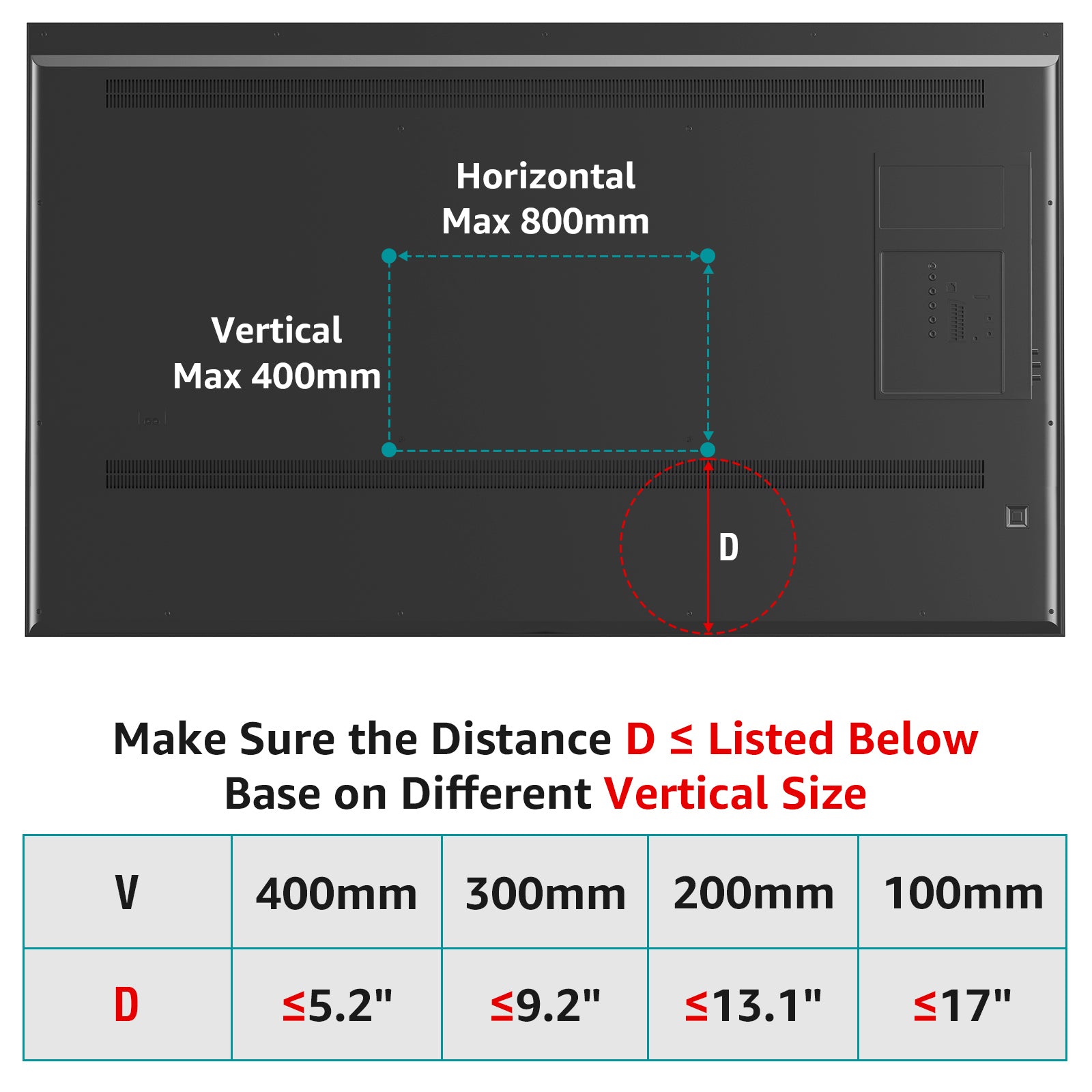 - Supports VESA mounting patterns ranging from 200x100mm to 800x400mm.